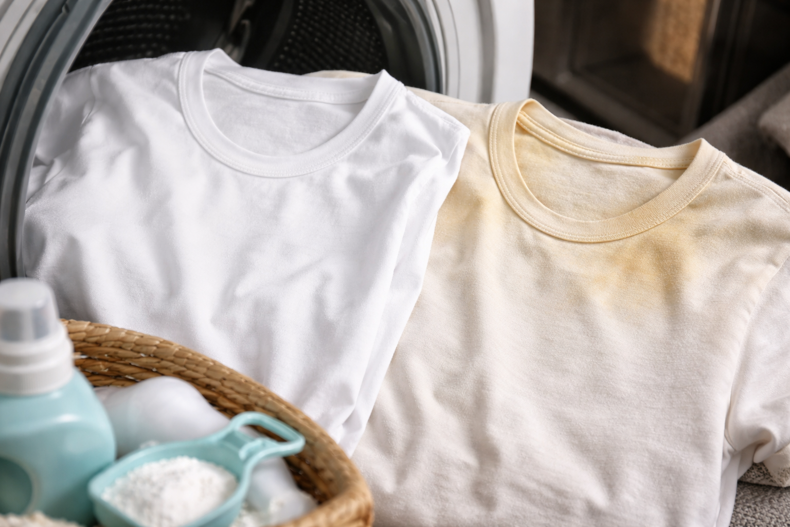 Реакция антиперспиранти с органична пот е друг мощен фактор за загуба на цвят. Алуминиевите соли са дълбоко вградени в тъканта и класическият прах за пране просто не е в състояние да разтвори тези химически съединения. Ако изперете любимата си тениска в гореща вода, белтъчните петна буквално се изпичат трайно в нишките.