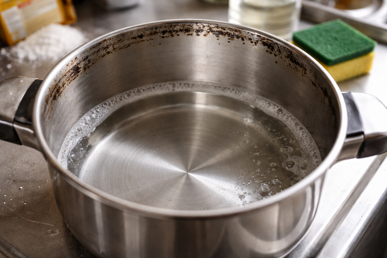 – Налейте гореща вода на дъното на разваления съд, така че да покрие изцяло проблемната зона. – Добавете обилно количество от нея вътре Детергент препарат за миене на съдове и разбъркайте. – Поставете съда върху котлона и оставете течността да заври леко. – Отстранете от огъня, изсипете обилно поръсена сода за хляб и залейте с половин чаша оцет. – Изчакайте, докато шумоленето спре, и просто излейте мръсната течност в мивката.
