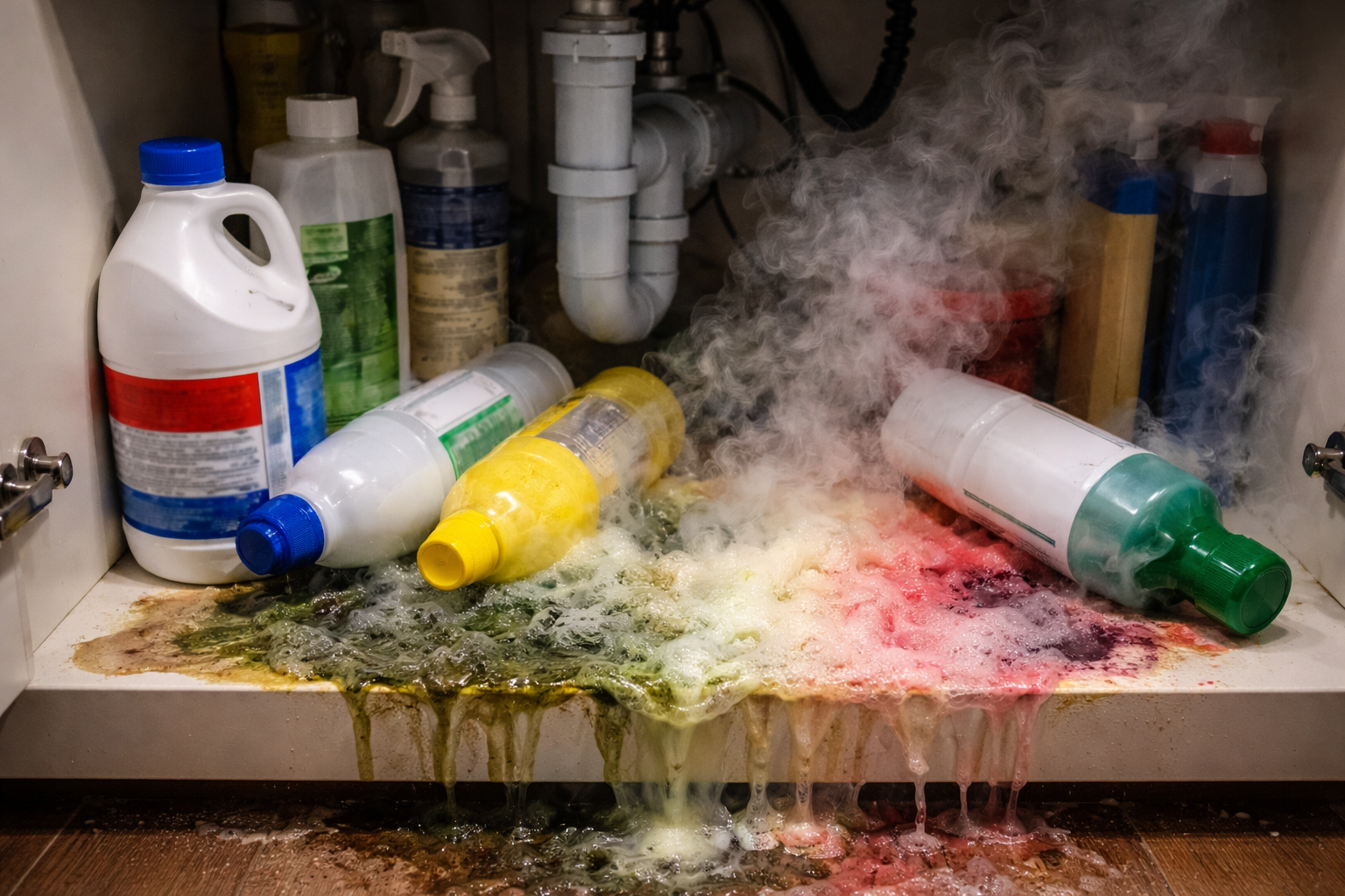 Желанието за по-бързо почистване на вкоренено петно често води до идеята да се смесят няколко мощни препарата. На практика този безобиден импулс завършва с развалени водопроводни тръби, химически изгаряния или спешно проветряване на целия апартамент. Сега ще ви кажа кои бутилки от вашия шкаф никога не трябва да се отварят едновременно, за да остане почистването безопасно и ефективно.