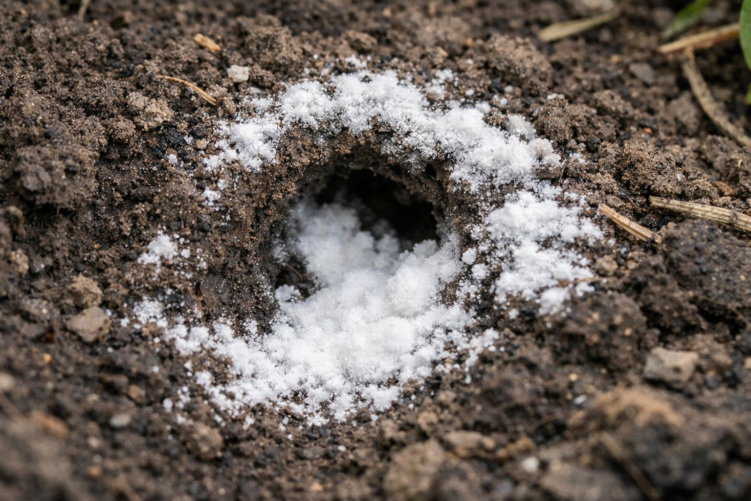 Таен нюанс: ако земята е твърде суха, първо залейте нората с чиста вода. Това ще „запечата“ страничните клони и содовия разтвор ще попадне в целта, без да се абсорбира в стените преди време.