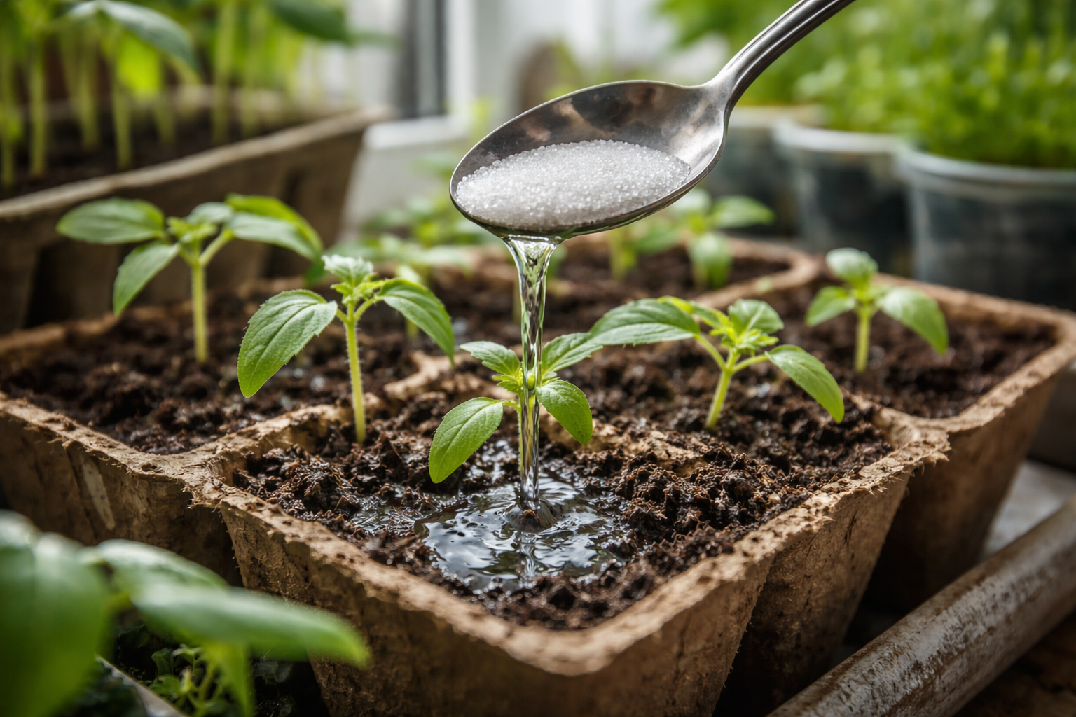 Всяка пролет много градинари се сблъскват с факта, че младите фиданки изглеждат слаби, растат бавно или пожълтяват на перваза на прозореца. Ще ви разкажа как обикновената захар от кухненския шкаф може бързо да възстанови жизнеността на растенията и да ускори развитието им без сложна химия.