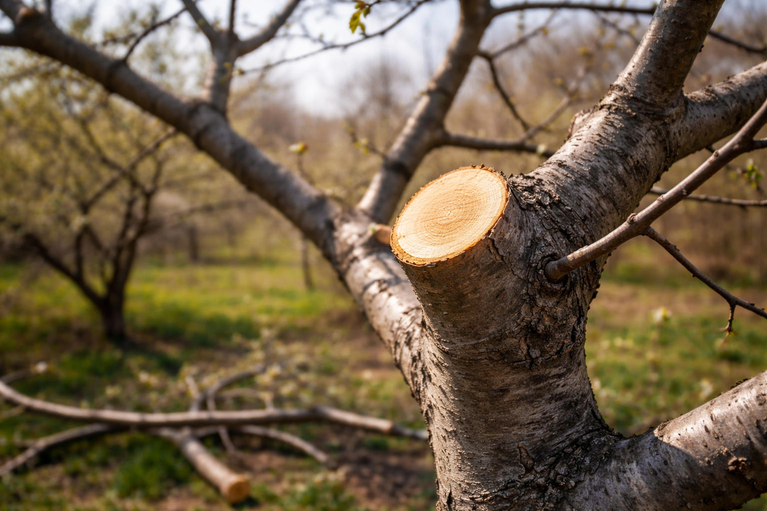 Отрязвайте клона стриктно „по пръстена“, без да оставяте стърчащи пънчета, за да може дървесната кора бързо да заздрави раната и да предотврати загниването на сърцевината.