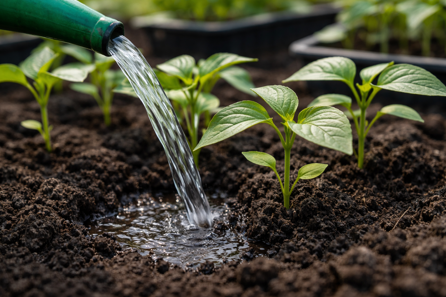 Никога не поливайте принудително с маркуч, тъй като това веднага води до ерозия на горния почвен слой и оголване на нежните корени на младите разсади.