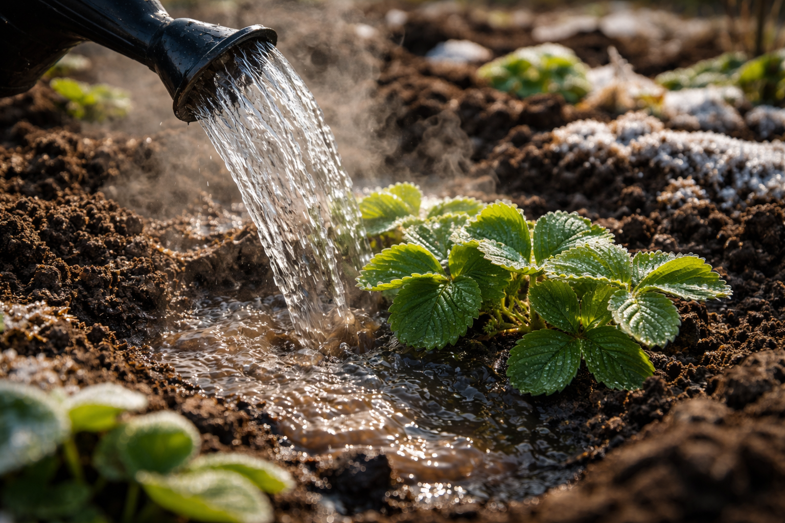 Основният таен нюанс се крие в създаването на ефекта на топлинна възглавница. Нагрятата влага прониква в дълбоките слоеве на почвата, като разтопява ледените кристали в микропорите и повишава общата температура на лехата с няколко градуса.
