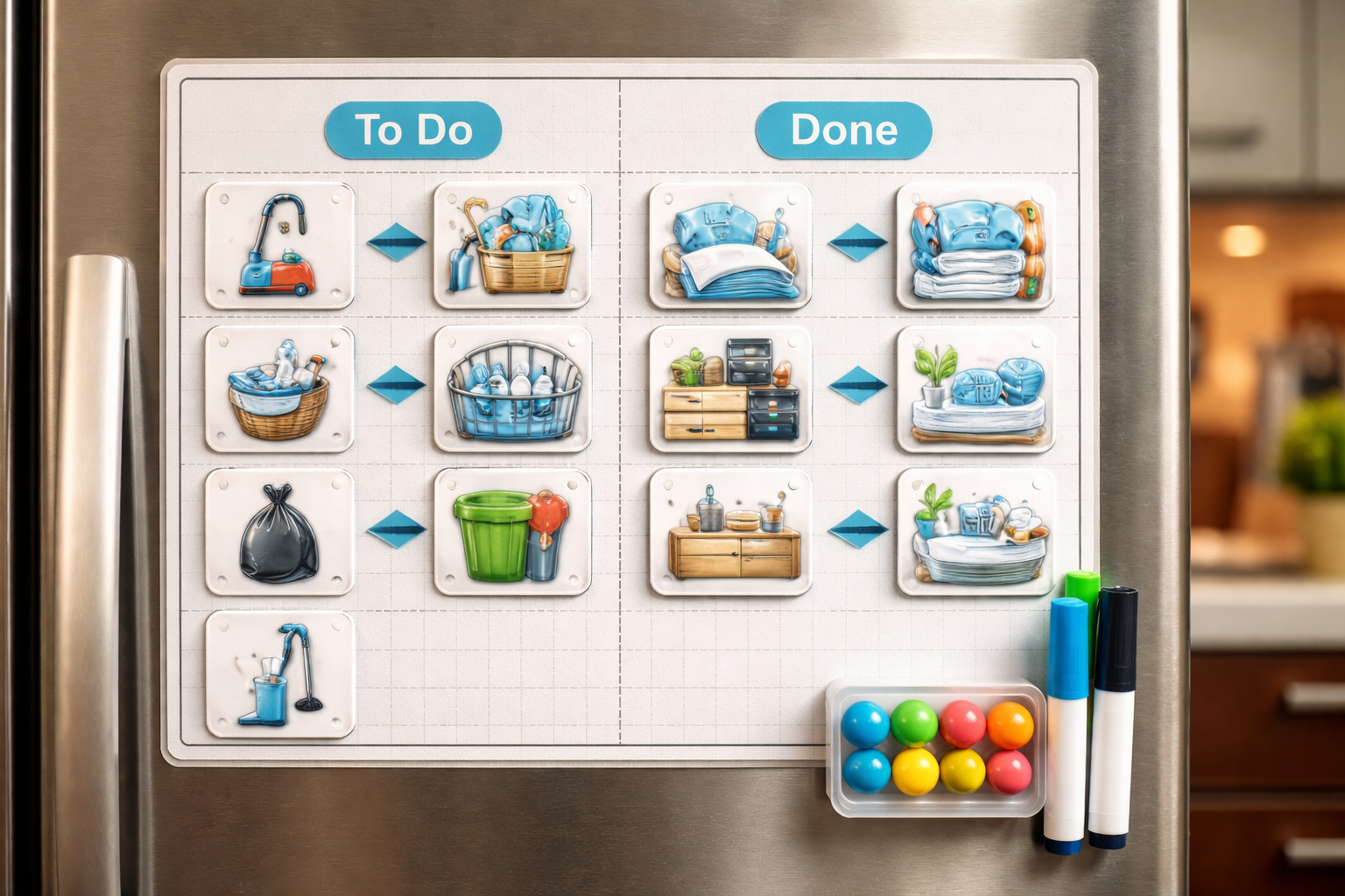 Таен нюанс: създайте визуална дъска с магнити, където всеки член на семейството може самостоятелно да отбелязва изпълнените задачи, като с радост ги премества от графата „за изпълнение“ в графата „свършено“.