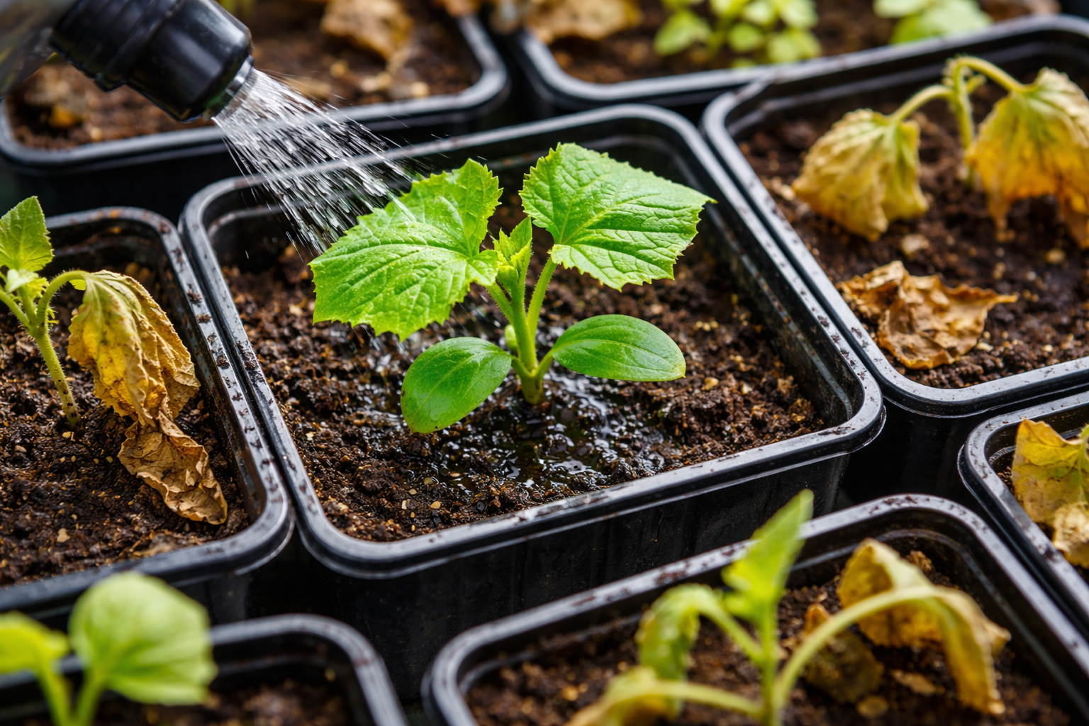 Правилното поливане е изкуство, което изисква строг баланс. Температурен стрес убива разсада също толкова бързо, колкото и сушата. Водата винаги трябва да се поддържа топла.