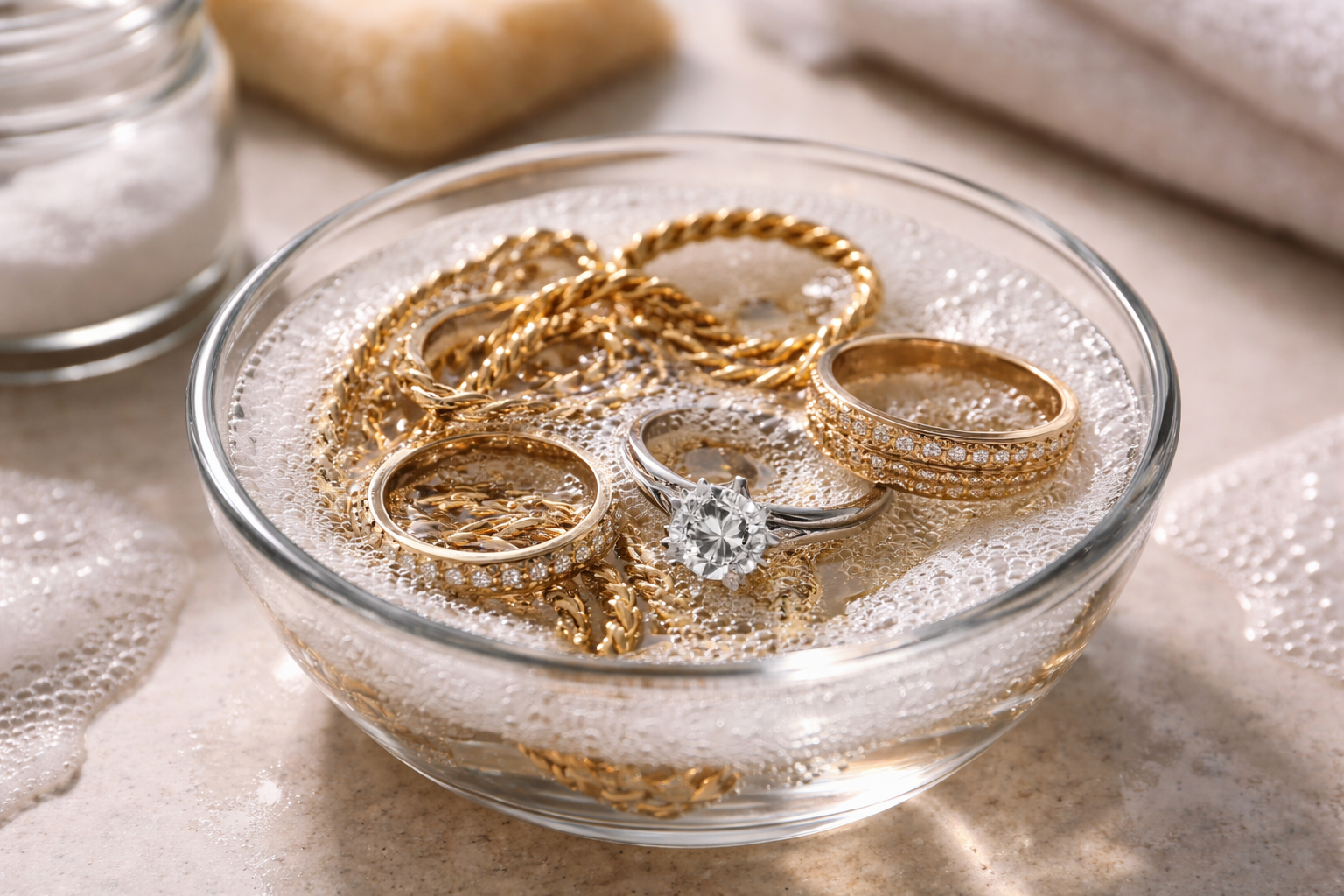 Основната тайна на перфектното почистване се крие в температурата на водата, тя трябва да е умерено топла, за да разтвори ефективно кожната мазнина, но да не повреди бижутерското лепило, което фиксира камъните.
