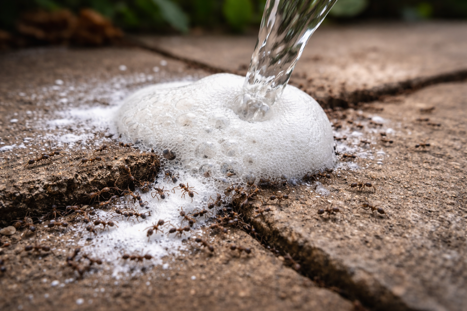 Основна грешка е просто да смесите съставките в кофа и да измиете пода. Тайната е да ги използвате последователно точно върху пътеките на мравките, като създавате реакция на освобождаване на газ точно там, където се събират вредителите.