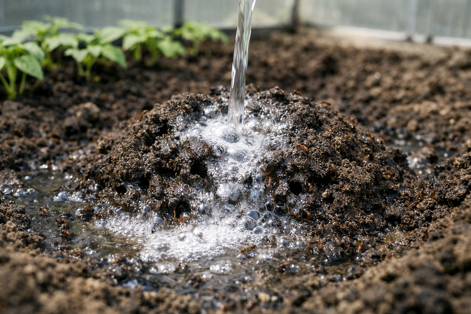 „Никога не изливайте стръмна вряла вода върху мравуняк директно под доматени храсти, тъй като това моментално ще свари корените на растенията и ще убие разсада.“