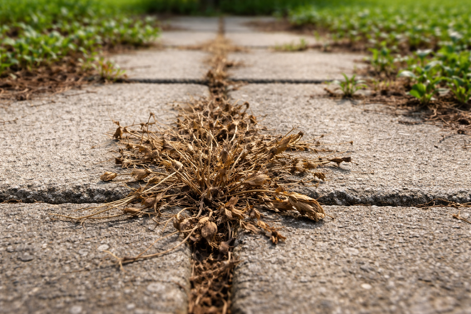 Най-бързият начин за премахване на обрастванията между плочките или по градинските пътеки е използването на концентрирана киселина от естествен произход. Обикновеният трапезен оцет разрушава клетъчните мембрани на нежеланите прорастъци, като ги кара бързо да се свият.