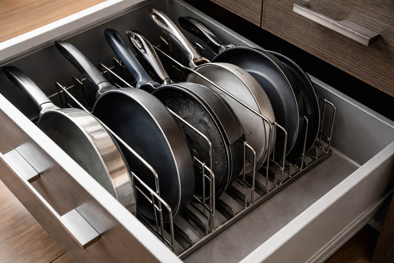 За тези, които предпочитат да съхраняват съдовете си в дълбоки чекмеджета, идеално решение са специалните чекмеджета. Разделители. Те ви позволяват да поставяте тигани по краищата им като книги на рафт. Това не само освобождава място, но и ви позволява да достигнете необходимия елемент с едно движение, без да се налага да пренареждате останалите.