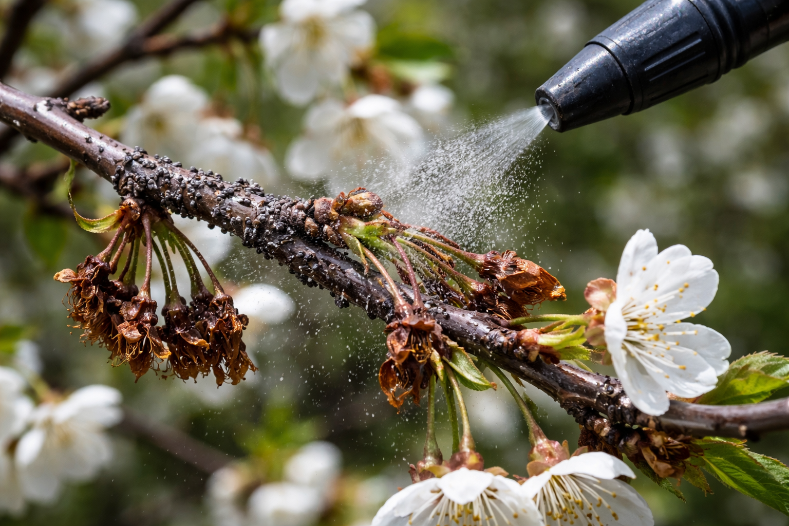 Тайният нюанс се крие във факта, че първичната инфекция се осъществява директно през пестила на отворения цвят, така че дърветата трябва да се пръскат стриктно в определена фаза – при розовата пъпка и веднага след падането на венчелистчетата.