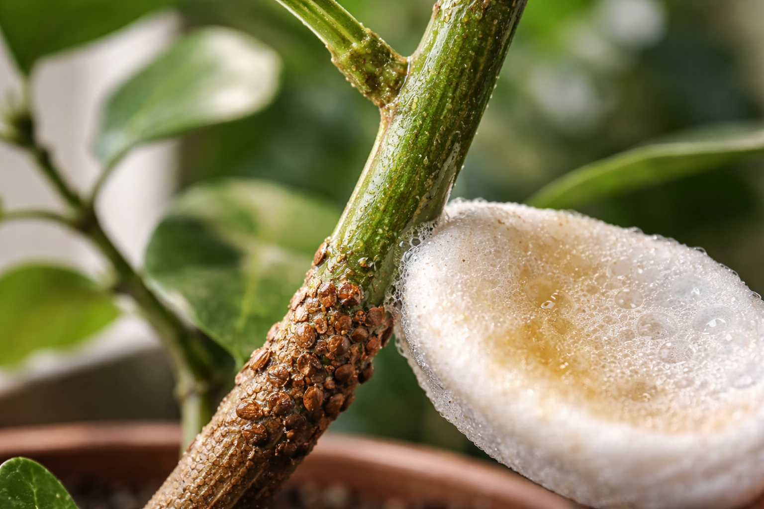 Процесът започва с внимателно отстраняване на черупки насекоми с четка, потопена в слаб спиртен разтвор или сапунена вода. Обърнете специално внимание на пазвите на листата и на долната страна на листната плоча покрай жилките.