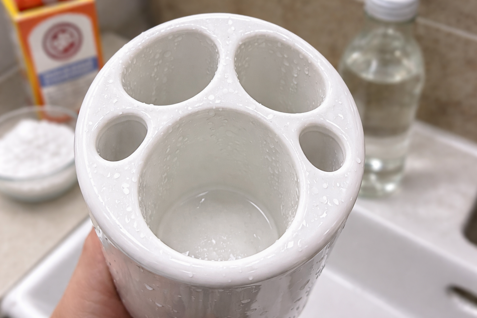 Често пренебрегваме този аксесоар по време на почистването, въпреки че той е този, който влиза в контакт с предметите ни за лична хигиена. На дъното се натрупва гъста маса, чието почистване с обикновена вода може да се окаже проблематично. Изпробвах много варианти и намерих най-добрия баланс между ефективност и безопасност.